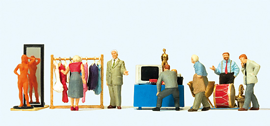 Brocante n°3‚ marché aux puces‚ fripes‚ objets divers‚ 6 personnages