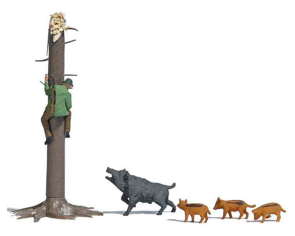 | |  | 7958 | 1/87 (HO) | Sanglier et 3 marcassins + chasseur se réfugiant en grimpant à un arbre | 22,50 € | | | |