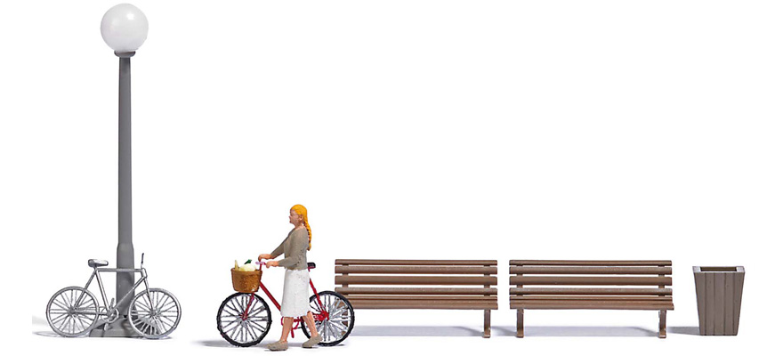 | |  | 7997 | 1/87 (HO) | Dame poussant son vélo avec panier rempli de légumes‚ 2 bancs‚ 1 lampadaire‚ 1 poubelle et un 2ième vélo | 19,95 € | | | |