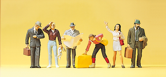 | |  | 10379 | 1/87 (HO) | 6 voyageurs sur le quai avec valises‚ journal‚ sacs‚ différentes attitudes | 17,95 € | | | |