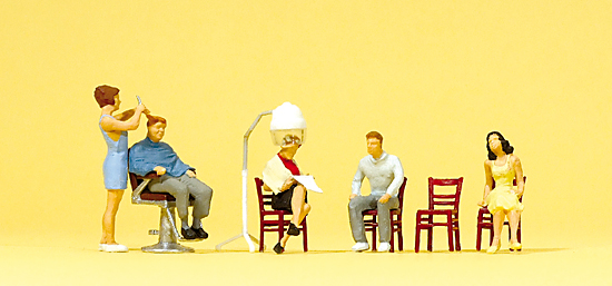 | |  | 10569 | 1/87 (HO) | 1 coiffeur et 4 clients chez le coiffeur‚ 4 chaises‚ 1 fauteuil‚ 1 sèche cheveux sur pied | 24,69 € | | | |