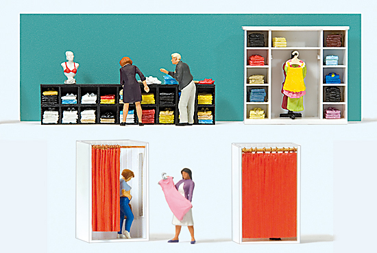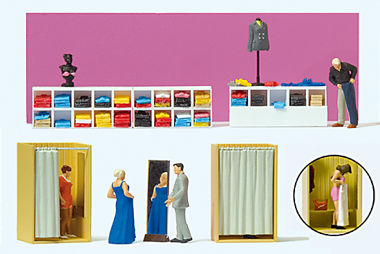 | |  | 10586 | 1/87 (HO) | Shopping dans une boutique de mode‚ 8 personnages et deux portants chargés de vêtements | 24,69 € | | | |