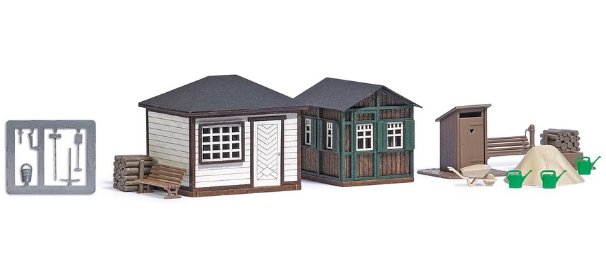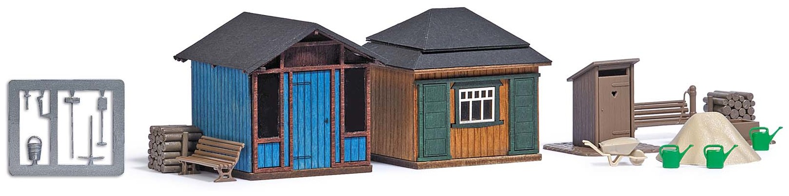 1617 1/87 (HO)Trois abris de jardin‚ dont WC‚ + clotures (long 650mm)‚ tas de sable‚ sauts‚ brouette‚ arrosoirs‚ outils‚ en kit 35,95 €Ajouter...