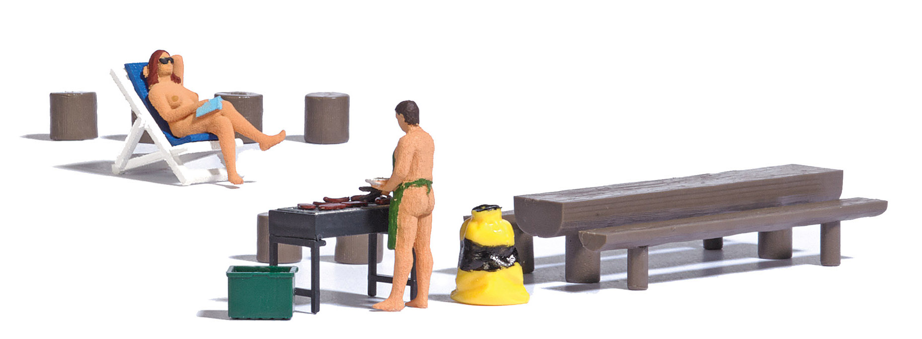 7946 1/87 (HO)Couple de naturistes au barbecue‚ (un homme nu habillé avec un tablier ‚ une femme nue allongée dans un fauteuil‚ 1 barbecue‚ 6 sièges en rondins de bois‚ table et bancs en rondins de bois‚ 1 sac de charbon de bois et 1 caisse de bières 18,95 €Ajouter...