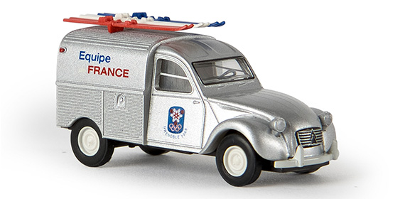 | | Brekina | 14141 | 1/87 (HO) | 2 CV Citroën camionnette‚ avec 6 skis bleu bleu rouge‚ ”Equipe FRANCE”‚ Jeux Olympiques Grenoble 1968 | 18,50 € | | | |